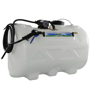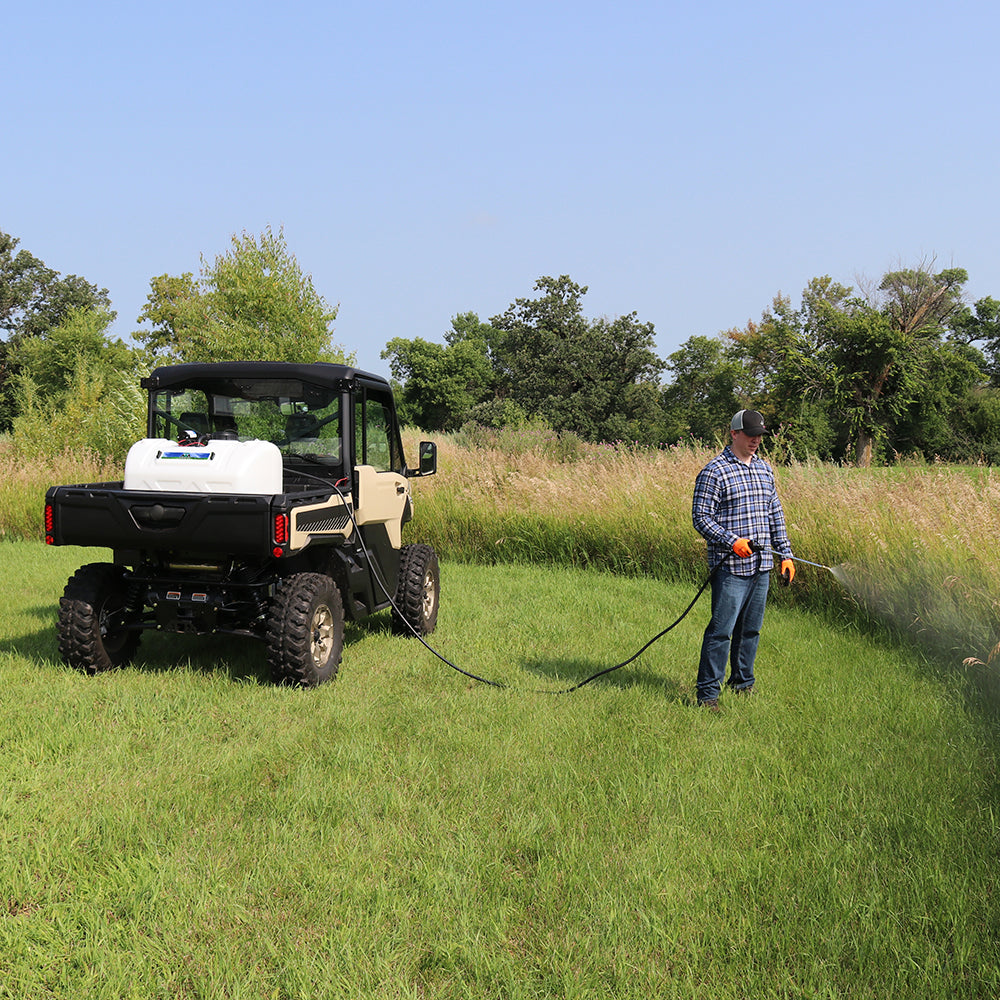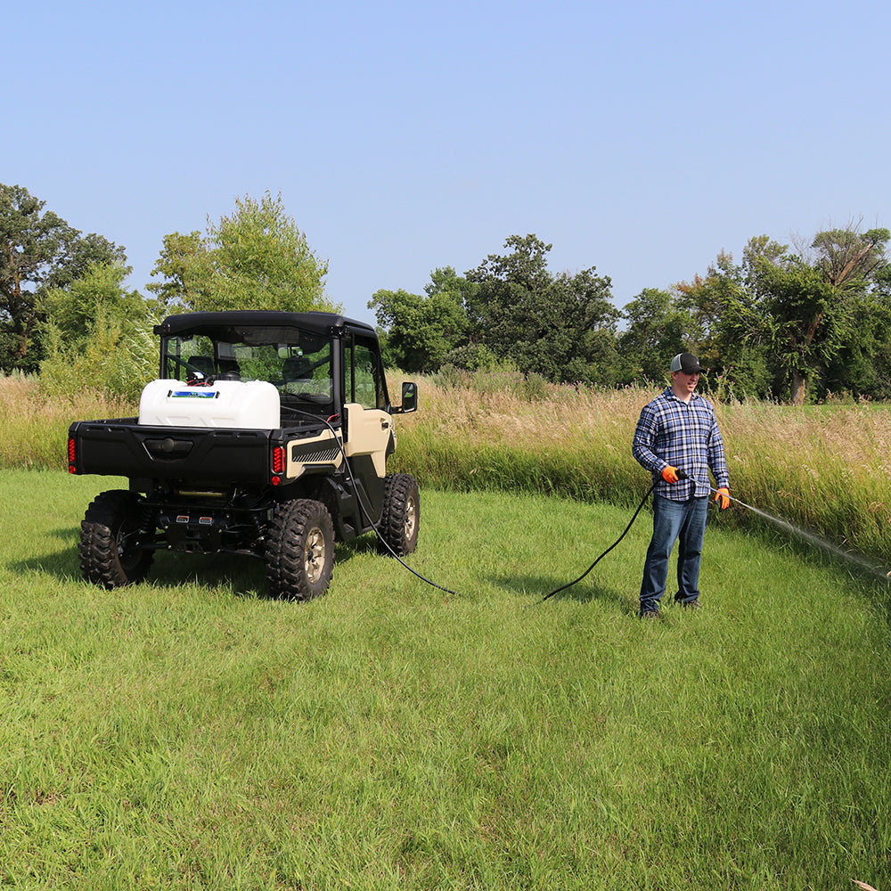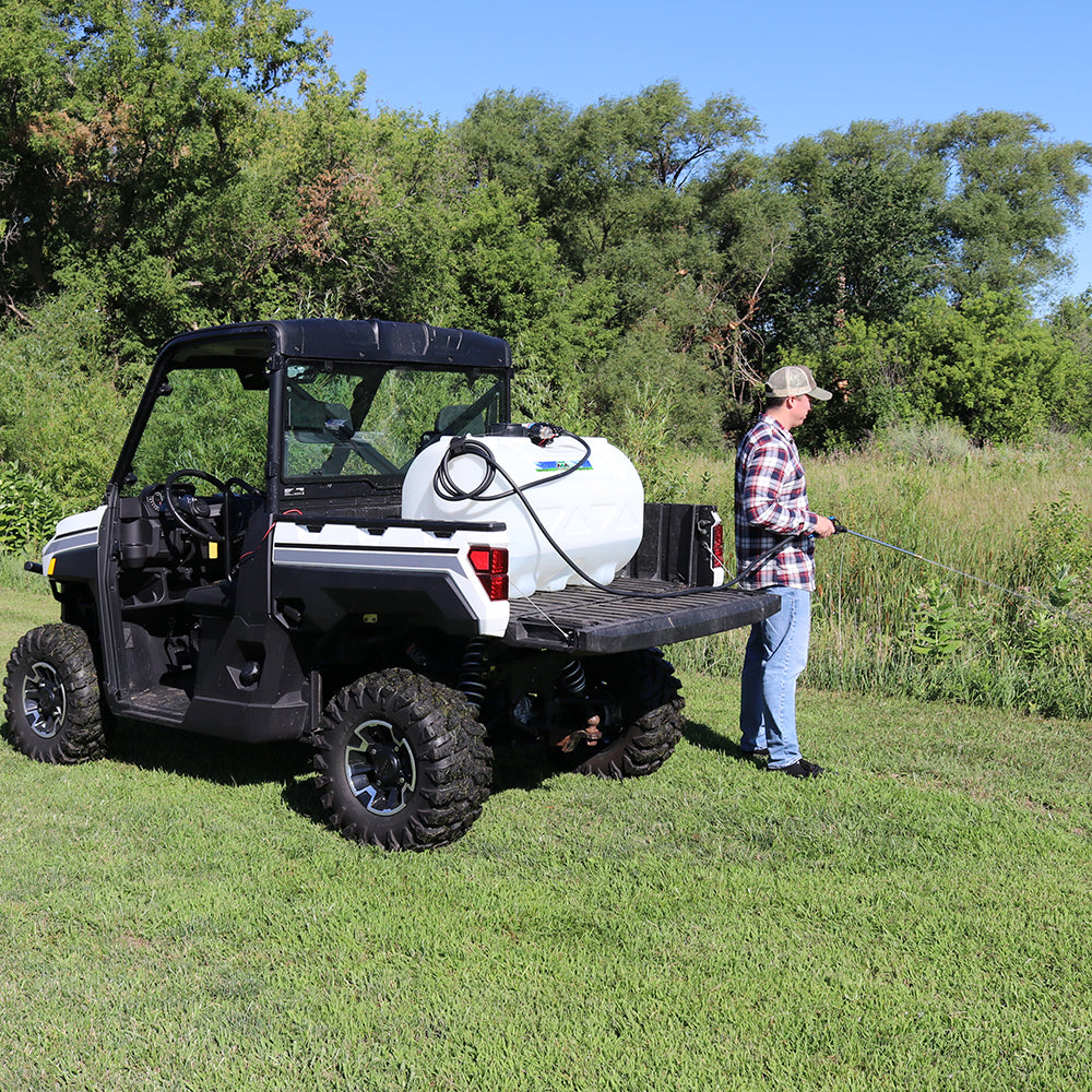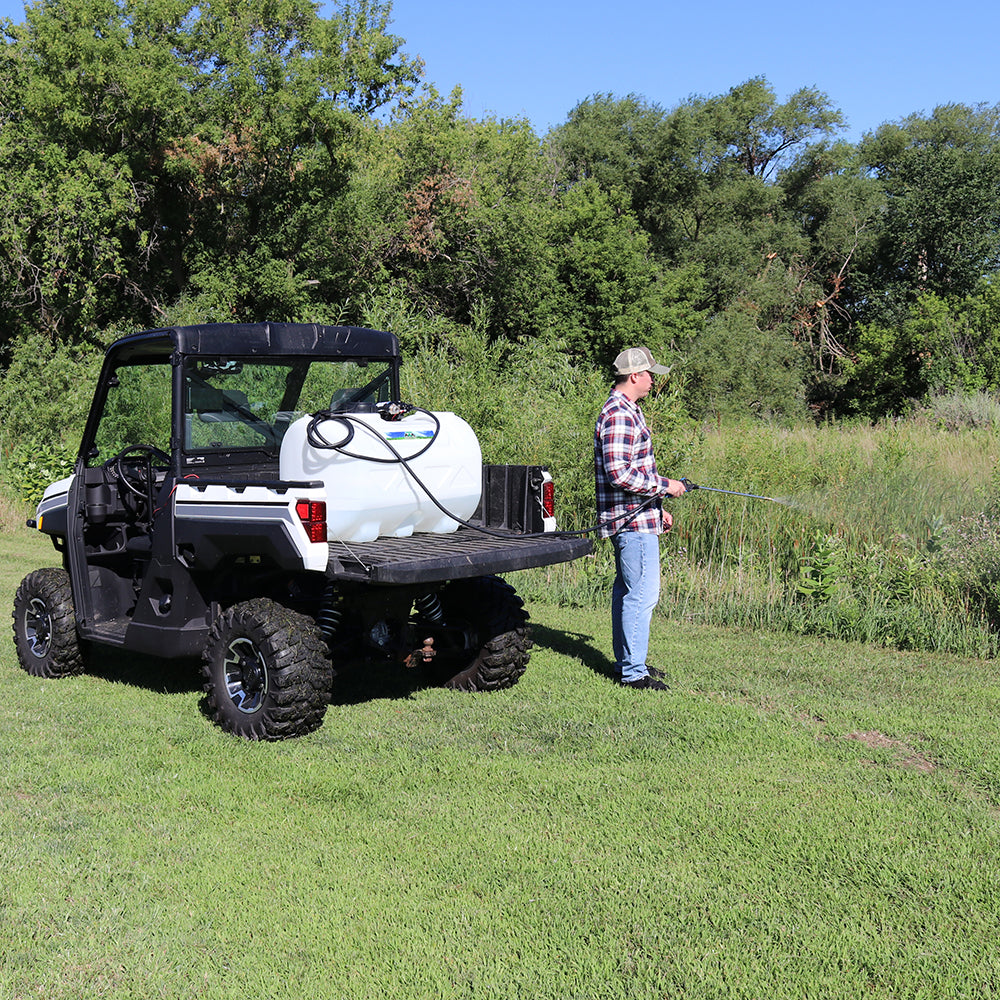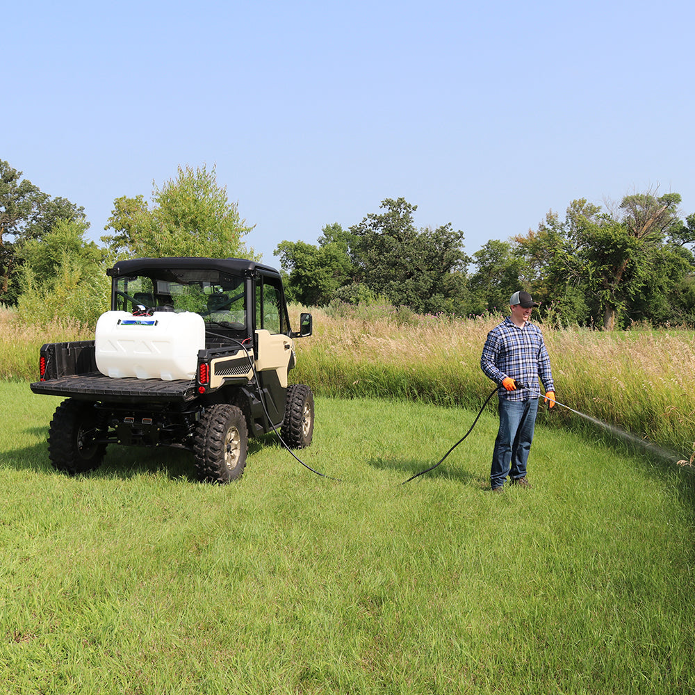 Sprayer Features: Be a sharp shooter with this 60 Gallon Deluxe Spot Sprayer. Featuring a robust Everflo 2.2 GPM 12V on-demand diaphragm pump. Keep debris and chemical clumps from entering your pump with the easy to maintain quick attach inline strainer. Keep your hose organized with the hook and loop hose strap that prevents any unwanted damage or dragging. Includes 15 feet of hose to spray gun that gives more flexibility for those hard to reach areas. After application use, drain remaining water and chemical with the accessible molded in drain port. Comes standard with 12v wire harness that features on/off switch and alligator clamp connection. UV resistant tank. Approved for use with Round-Up® and other agricultural brand herbicides and insecticides. Backed by a two-year warranty on pump & components. Can be used with UTVs and other means of transportation with some modifications.