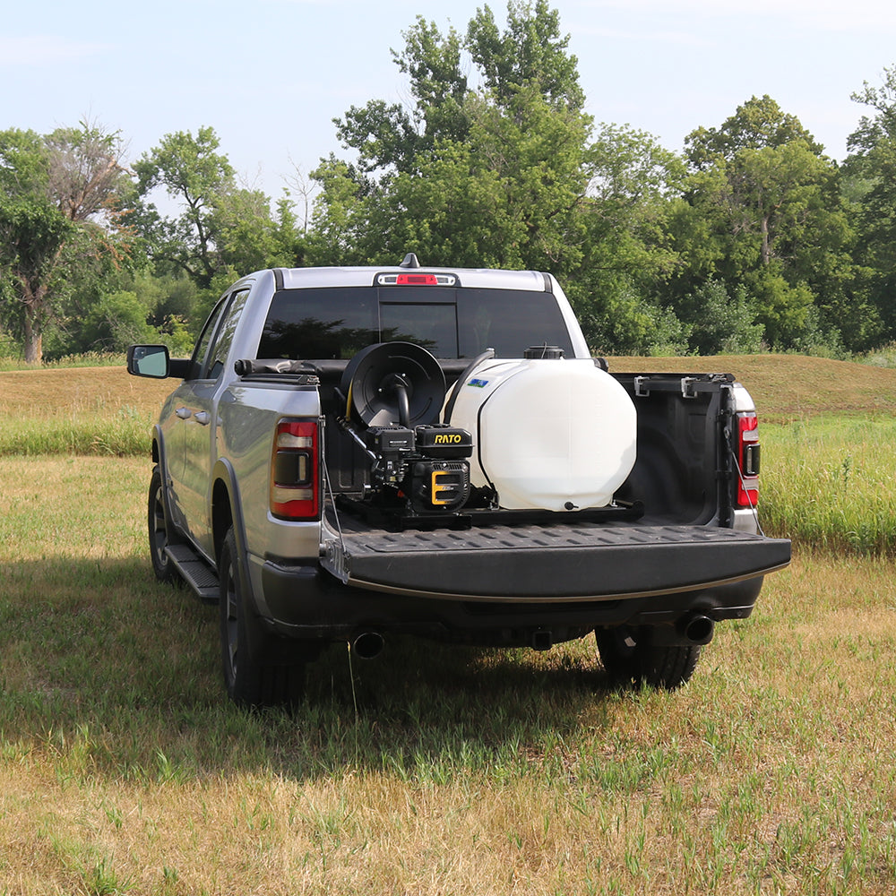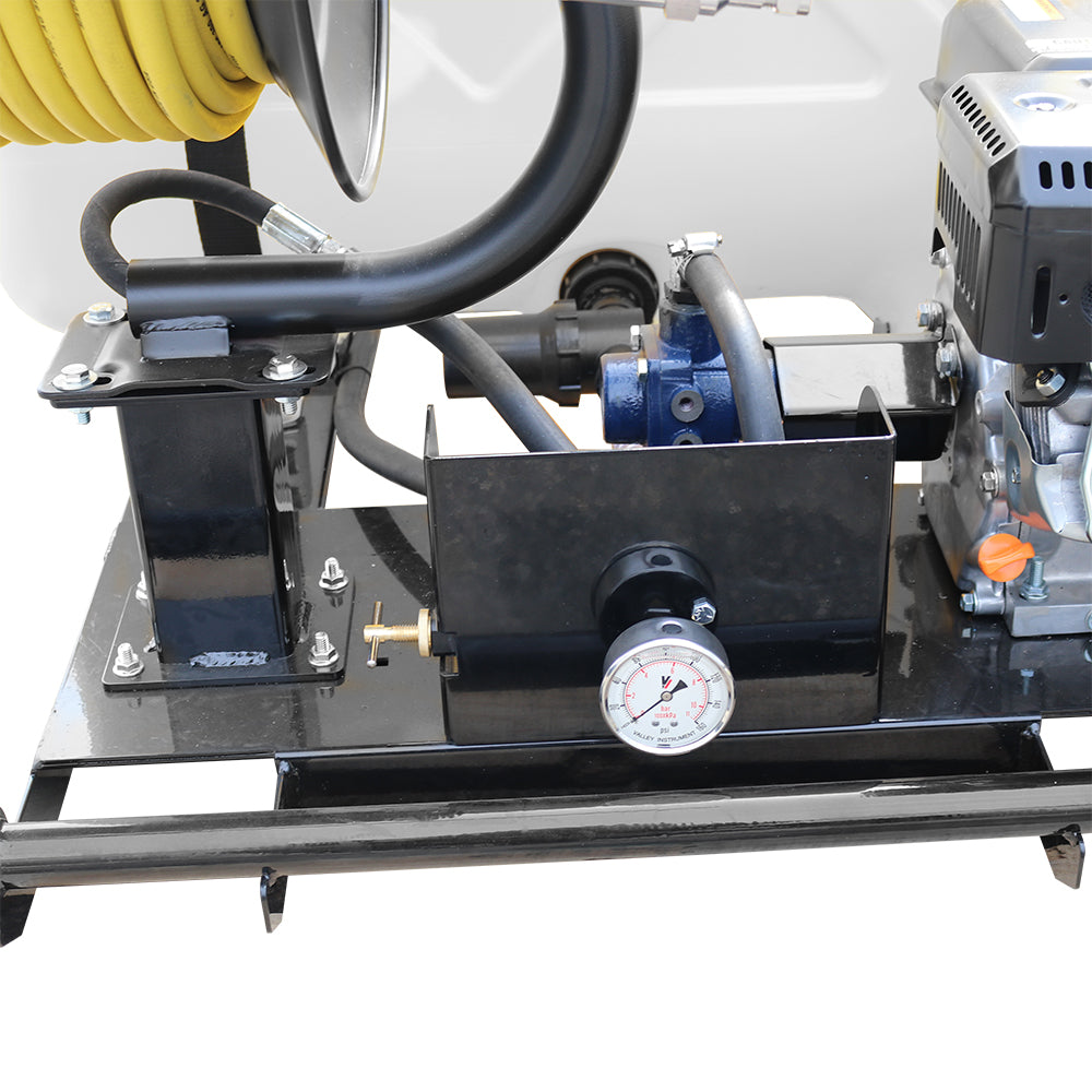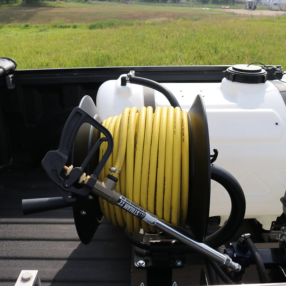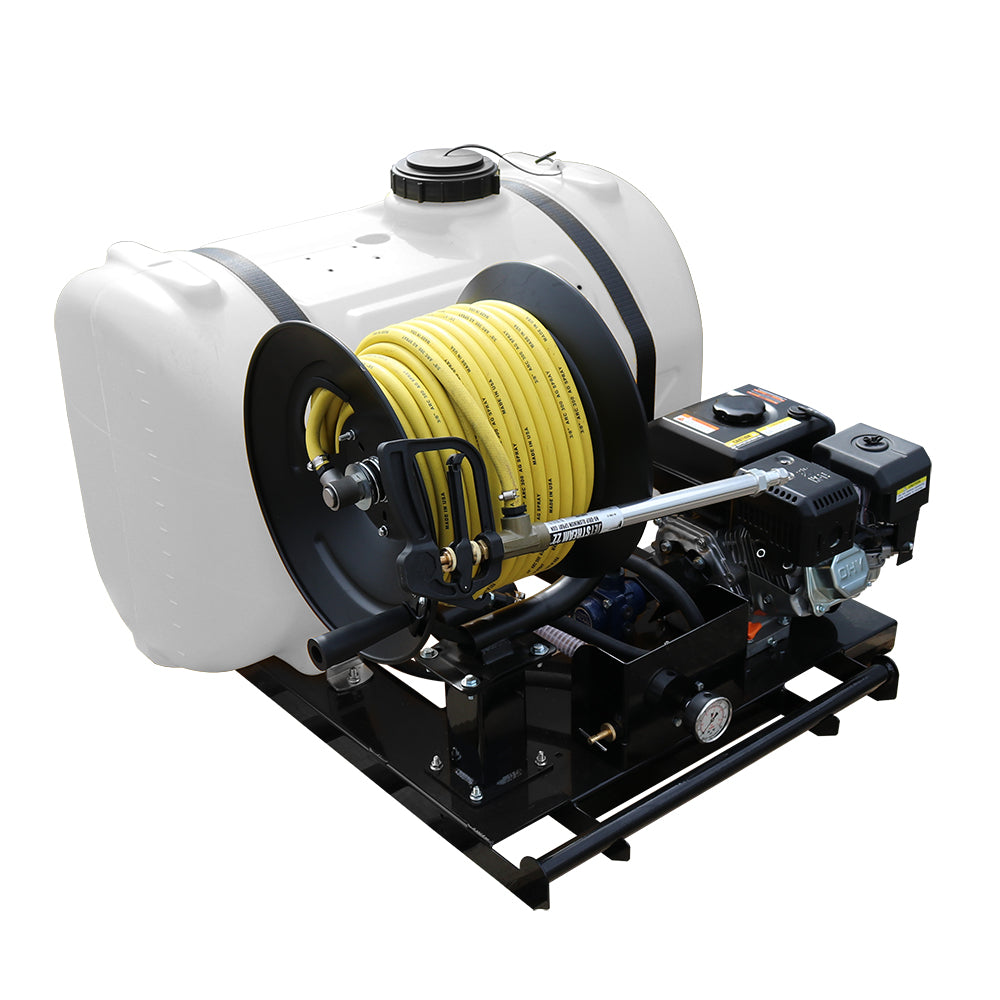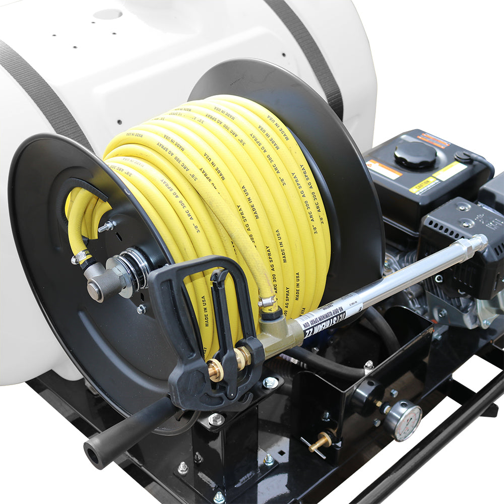 Additional features include an inline filter to prevent debris and chemical clogs, a powder-coated steel manual hose reel to neatly store the included 3/8" 150-foot high-pressure hose, and a sump at the base of the tank for thorough drainage. The all-steel frame features team lift handles and fork lift pockets, making it easy to transport via UTV, truck, or other commercial vehicles. Approved for use with Round-Up® and other agricultural brand herbicides and insecticides. Backed by a two-year warranty on pump and components.