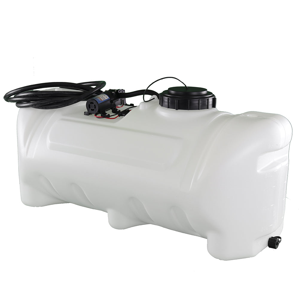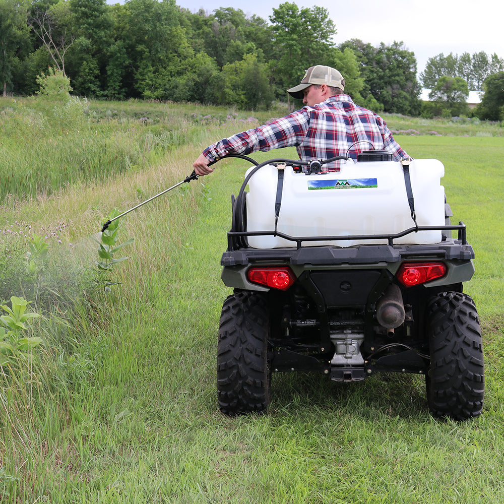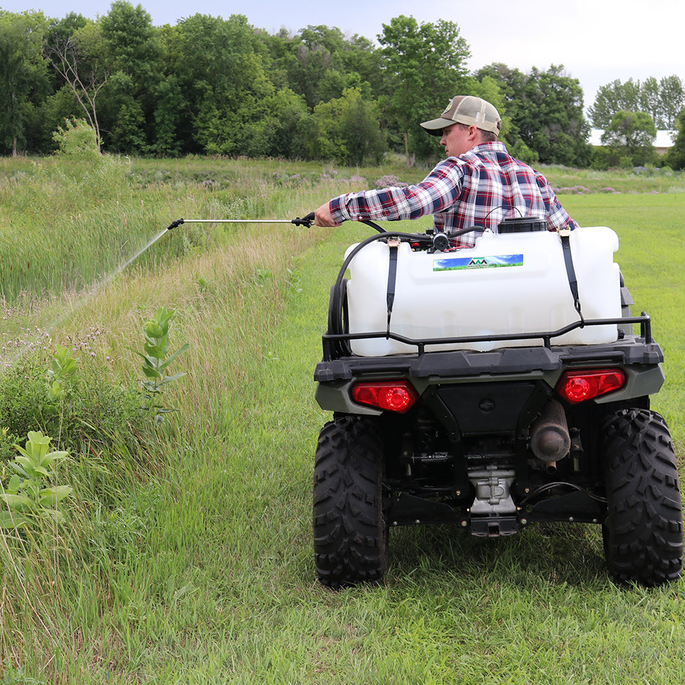 Sprayer Features: Be a sharpshooter with the 25-Gallon Spot Sprayer, equipped with a dependable Everflo 1.0 GPM 12V on-demand diaphragm pump. The UV-resistant tank features built-in quick grip handles for easy loading and unloading, plus a molded-in drain port for fast cleanout after use. Includes 15 feet of hose for extended reach, along with a 12V wire harness and alligator clamp connection. Approved for use with Round-Up® and other agricultural herbicides and insecticides. Backed by a 2-year warranty on pump & components. Compatible with UTVs and other vehicles with light modifications.