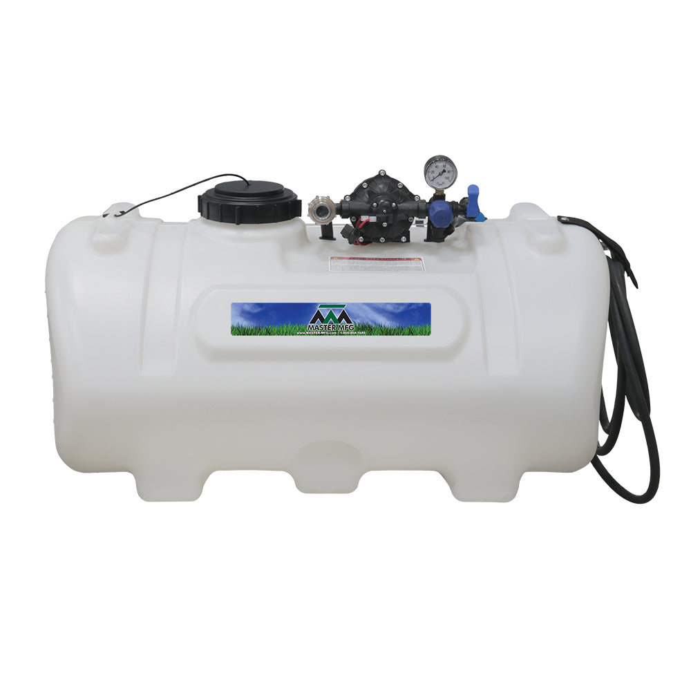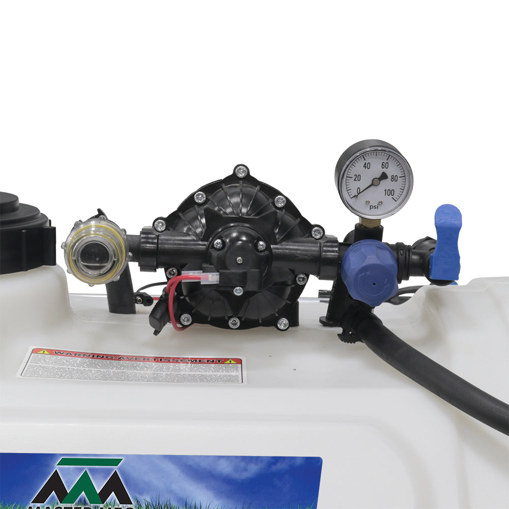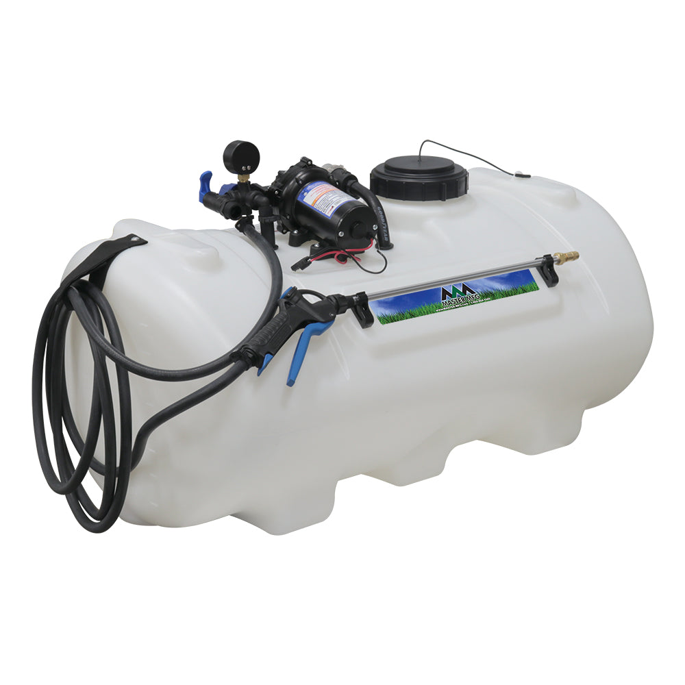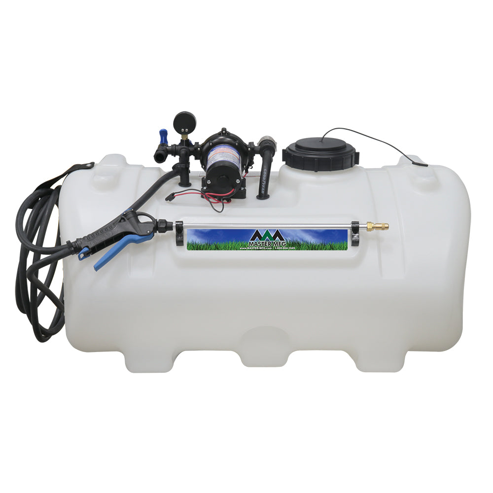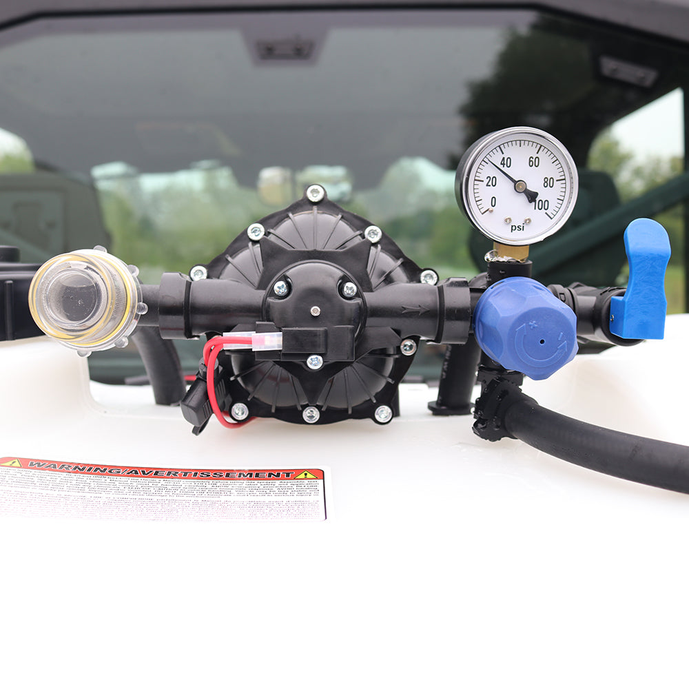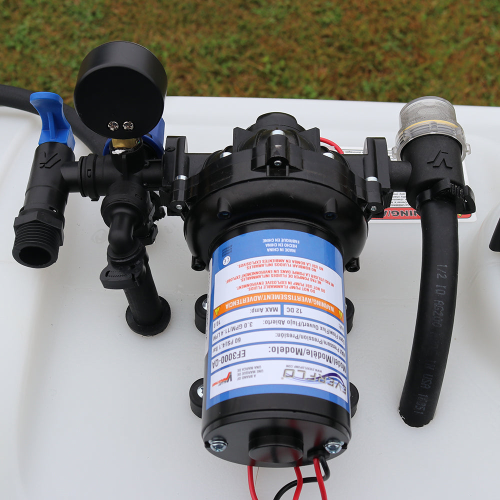 Sprayer Features: Take aim with the 40-Gallon Deluxe Spot Sprayer, built for precision and power. Outfitted with a heavy-duty Everflo 3.0 GPM 12V on-demand diaphragm pump, this setup includes a pressure gauge, adjustable regulator, and shut-off valve for full flow control. A quick-attach inline strainer keeps debris out of the pump, while a hook-and-loop strap keeps the hose secure and protected.