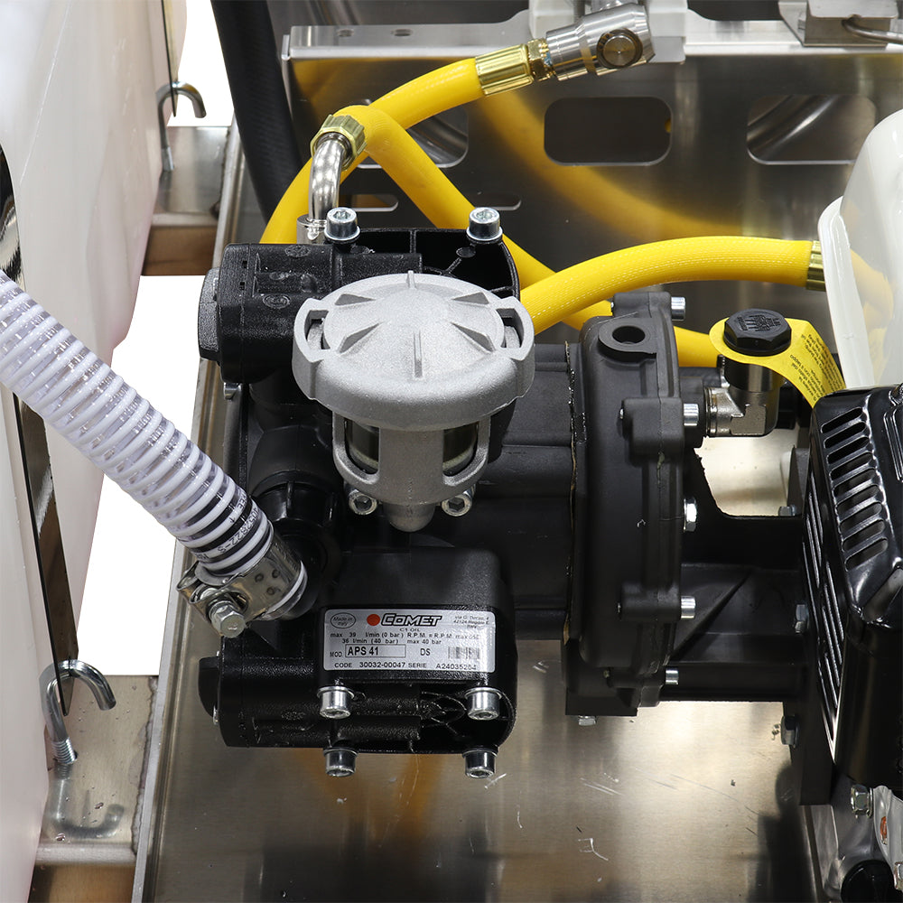 Sprayer Features: Maximize efficiency and profits with the Master Manufacturing 110-Gallon Low-Profile Professional Lawn Care Sprayer. Its compact, low-profile design provides excellent rear visibility in your truck, while forward-facing controls allow quick and easy adjustments. Comes standard with a 12” Hardcore manual hose reel for extended reach, paired with 200 feet of ½” heavy-duty hose. Featuring a Comet APS 41 diaphragm pump, this sprayer delivers reliable, consistent flow every time. Built with a corrosion-resistant aluminum frame and forklift-accessible slots, it’s designed for durability and ease of transport. Backed by a two-year warranty on pump and components.