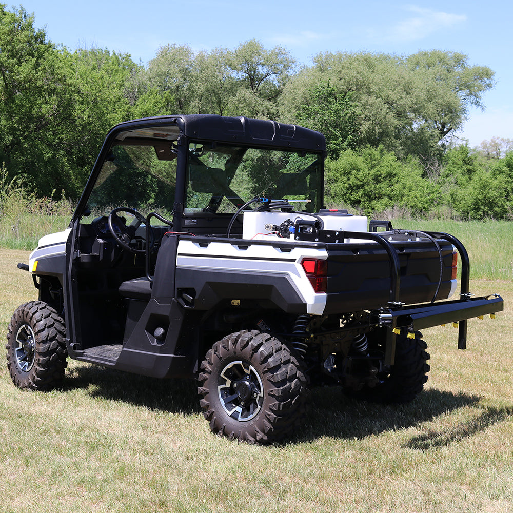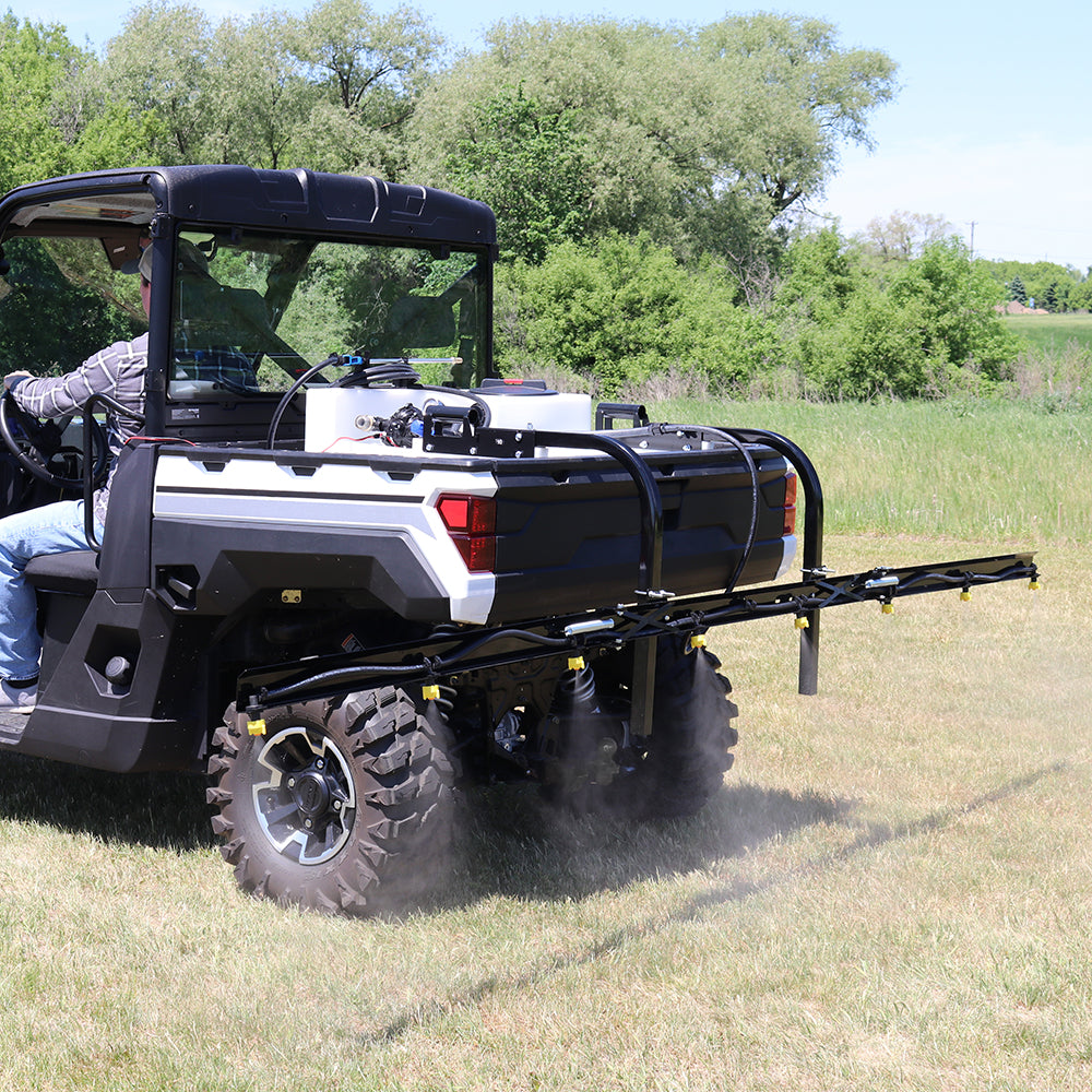 Broadcast Spraying: Premium, heavy-duty broadcast spray boom with a 13 foot spray swath. Featuring quick attach, no-drip spray nozzles that prevent excessive chemical dripping after spraying. With fold-able wings, easily prevent damage from oncoming obstacles, such as trees, or fold wings in for more compact storage. Comes standard with eight flat fan nozzles.