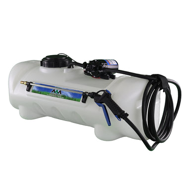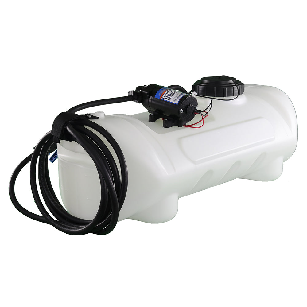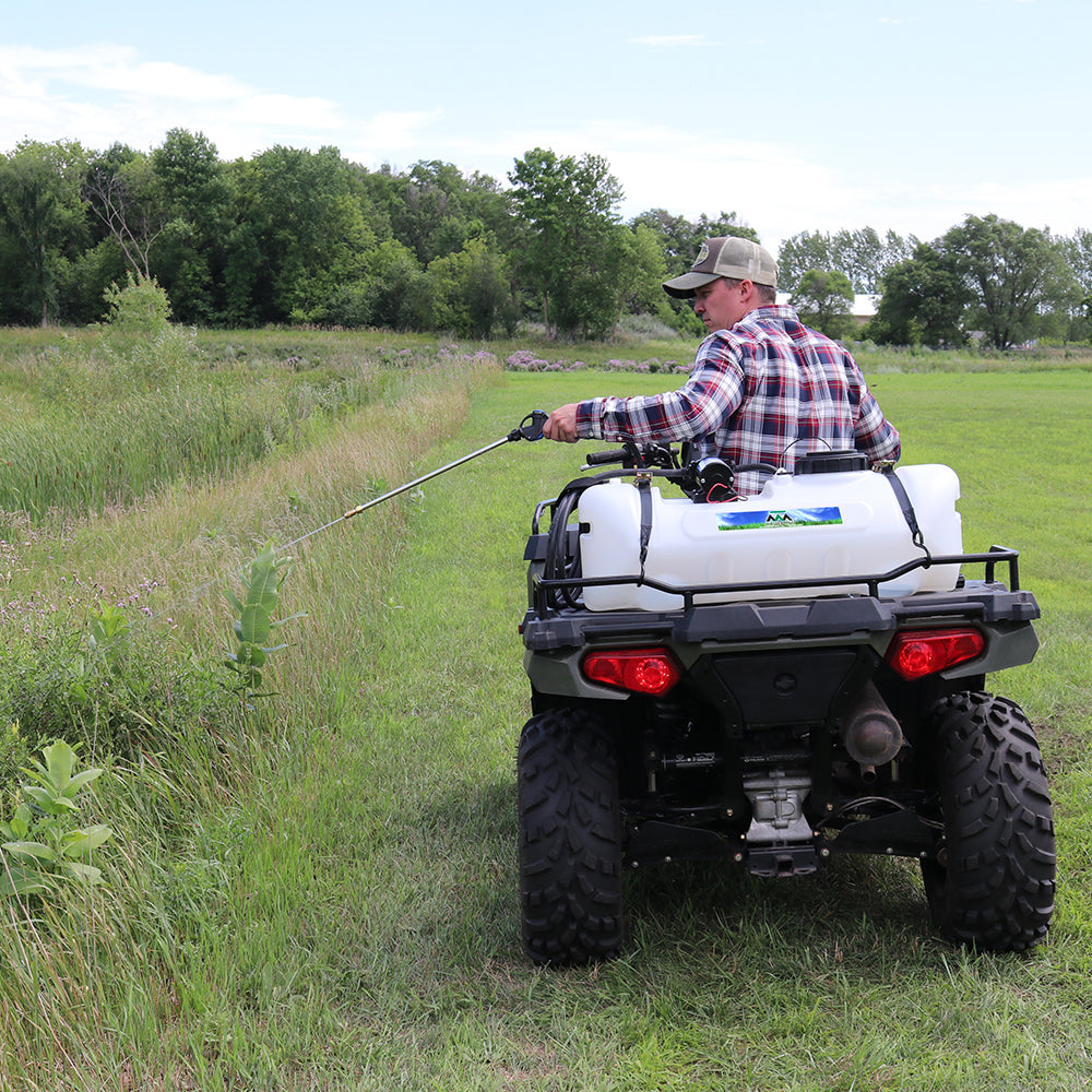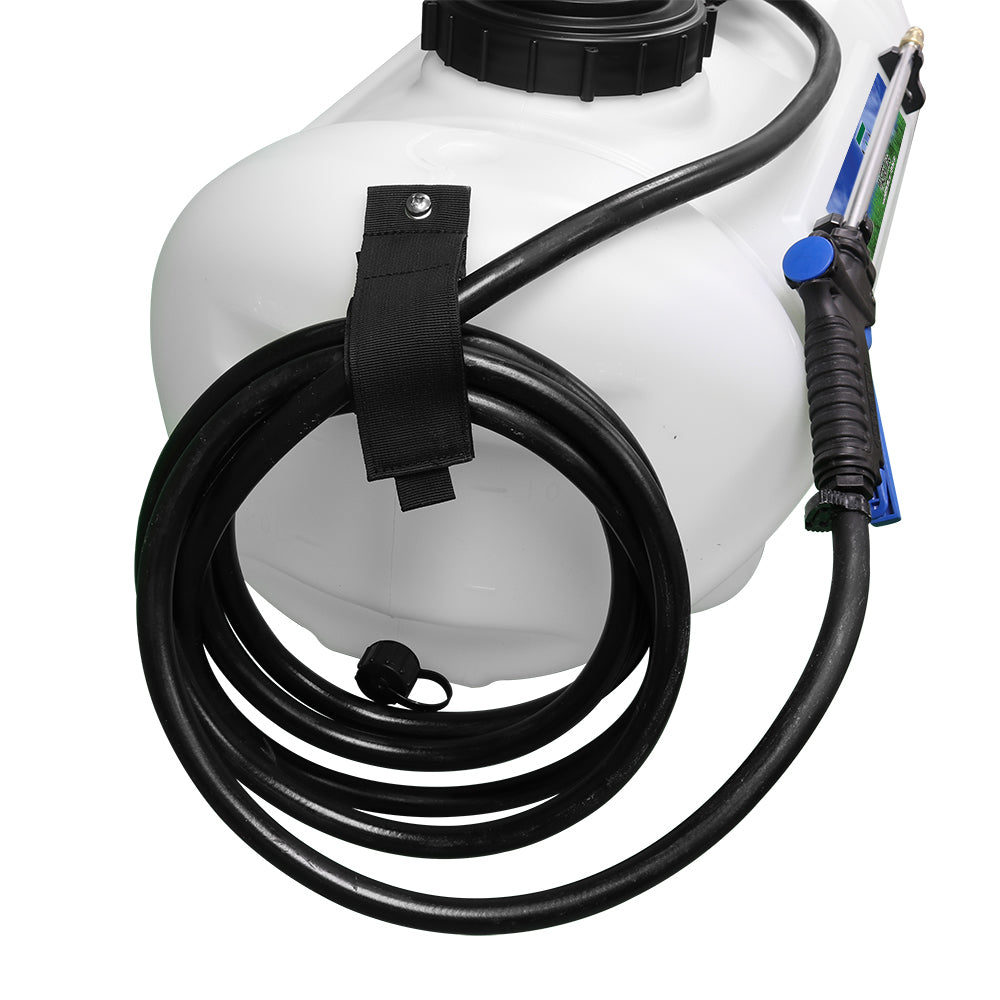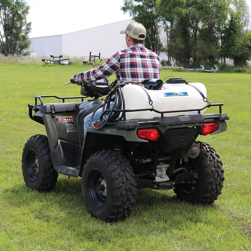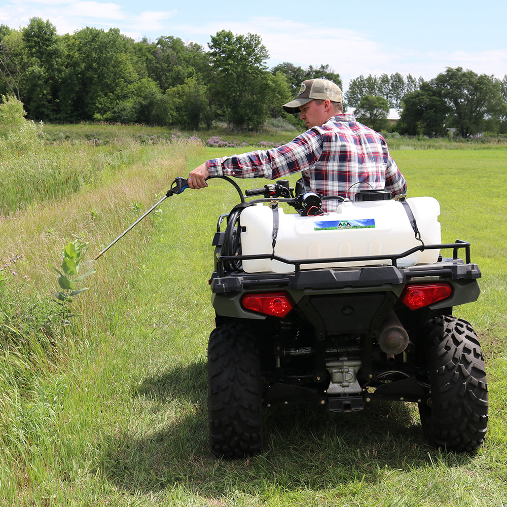 Sprayer Features: Be a sharpshooter with the 15-Gallon Deluxe Spot Sprayer, powered by a durable Everflo 2.2 GPM 12V on-demand diaphragm pump. The UV-resistant tank features built-in quick grip handles for easy loading and unloading, a molded-in drain port for fast cleanout, and a hook-and-loop strap to keep your hose organized and protected. Includes 15 feet of hose for extended reach, plus a 12V wire harness with alligator clamp connection. Approved for use with Round-Up® and other agricultural herbicides and insecticides. Backed by a 2-year warranty on pump & components. Works with UTVs and other vehicles with light modifications.