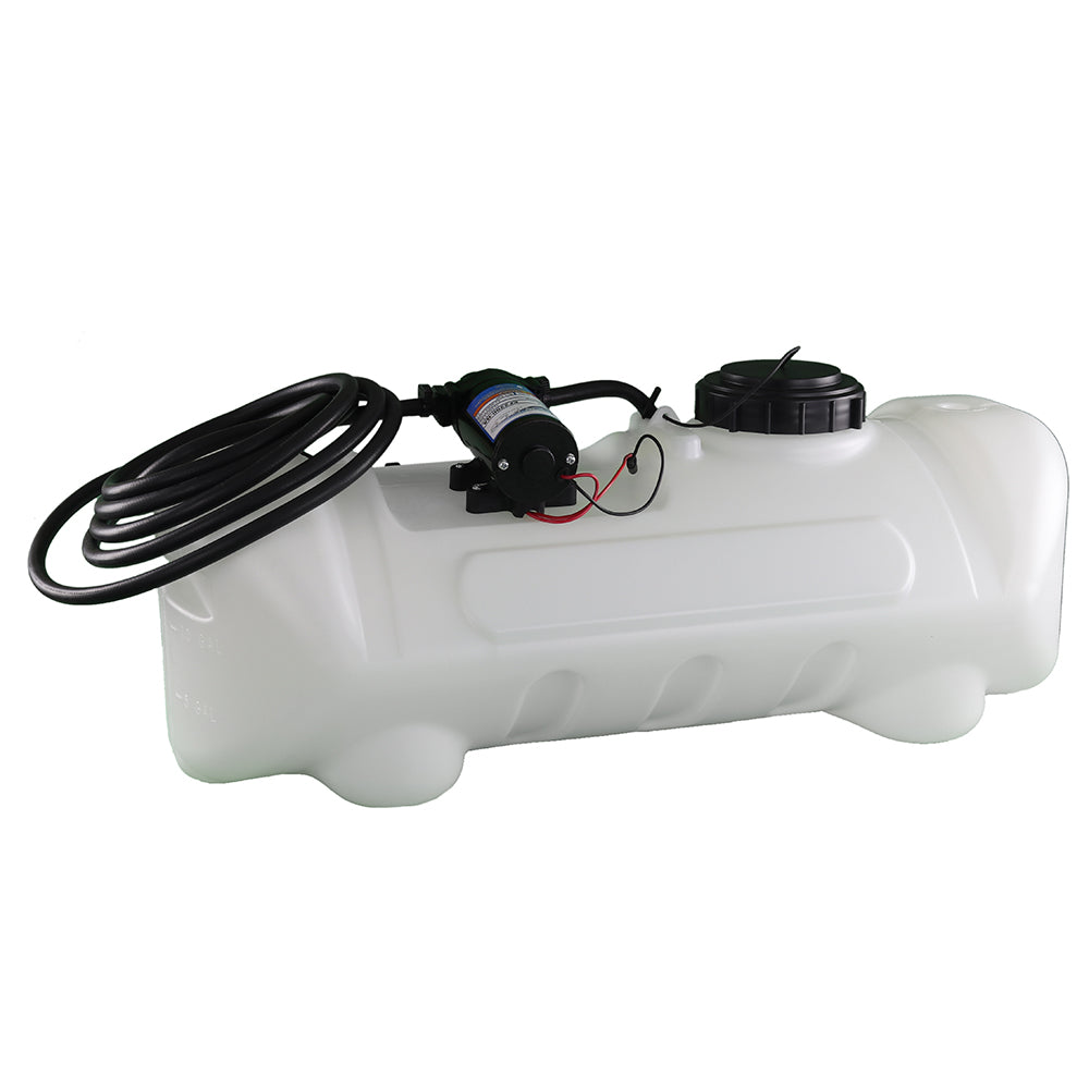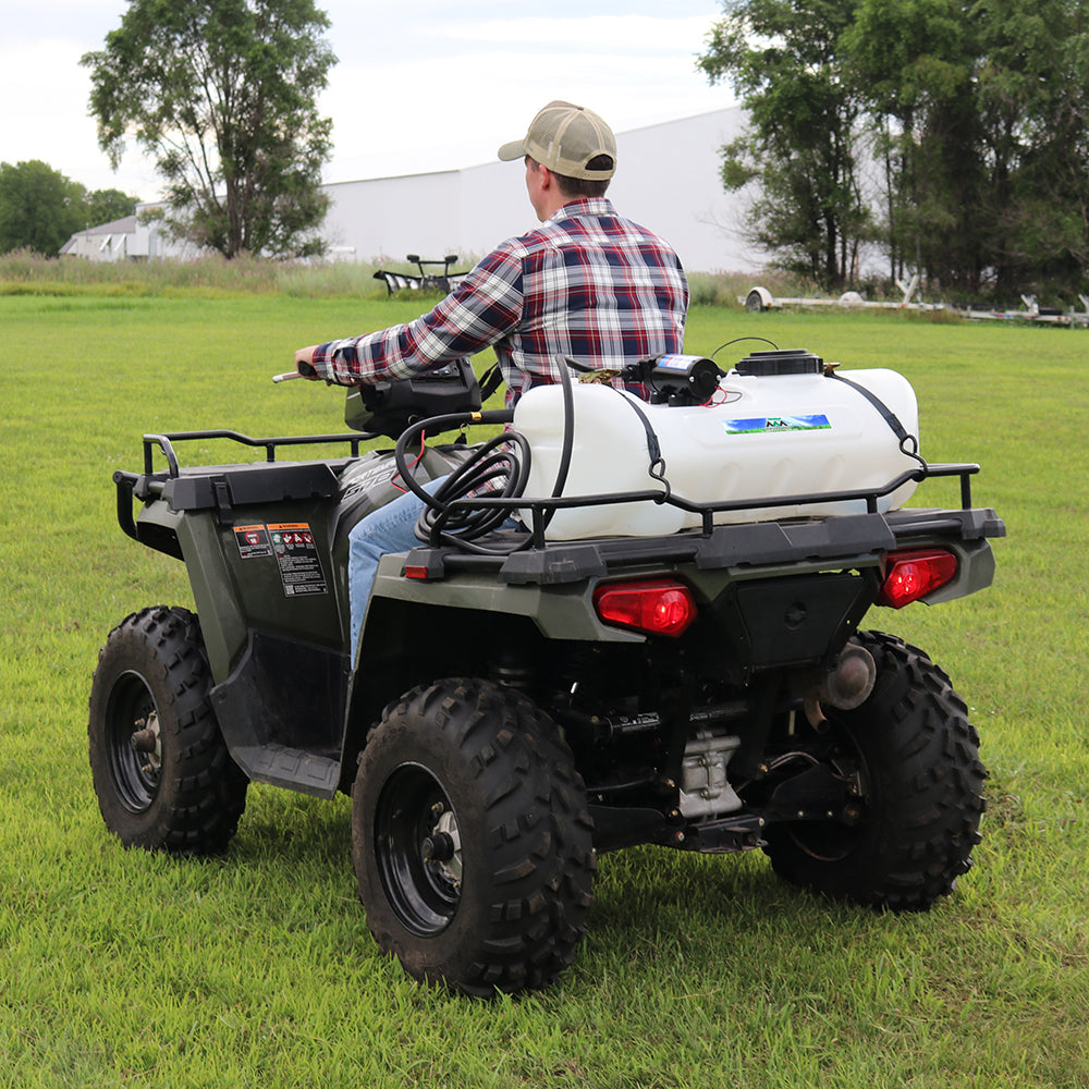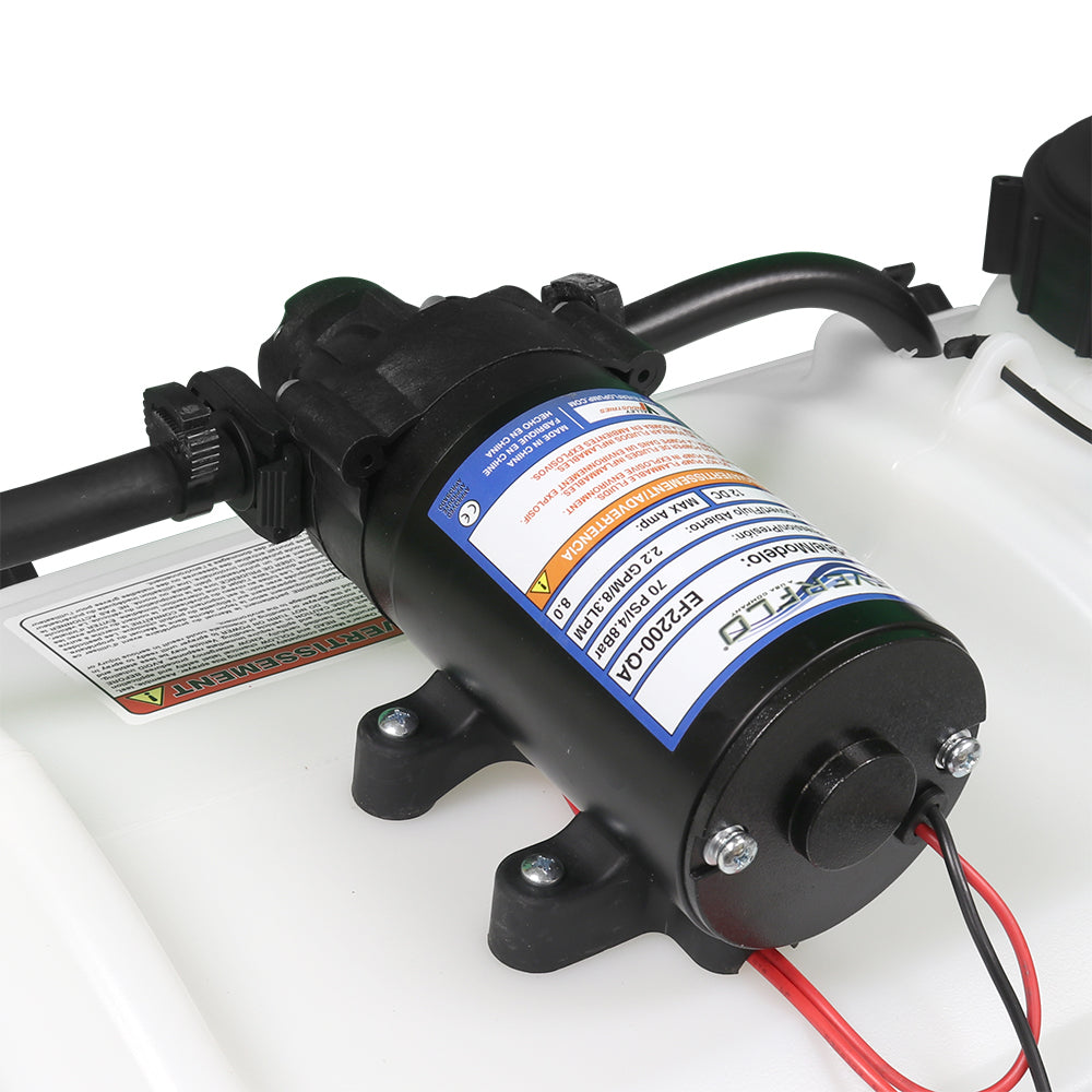 Sprayer Features: Be a sharpshooter with the 15-Gallon Spot Sprayer, featuring a powerful Everflo 2.2 GPM 12V on-demand diaphragm pump. The UV-resistant tank includes quick-grip handles for easy transport, a molded-in drain port for fast cleanup, and 15 feet of hose for reaching tight or distant areas. Comes standard with a 12V wire harness with on/off switch and alligator clamp connection. Approved for use with Round-Up® and other agricultural herbicides and insecticides. Backed by a 2-year warranty on pump and components. Compatible with UTVs and other vehicles with minor modifications.