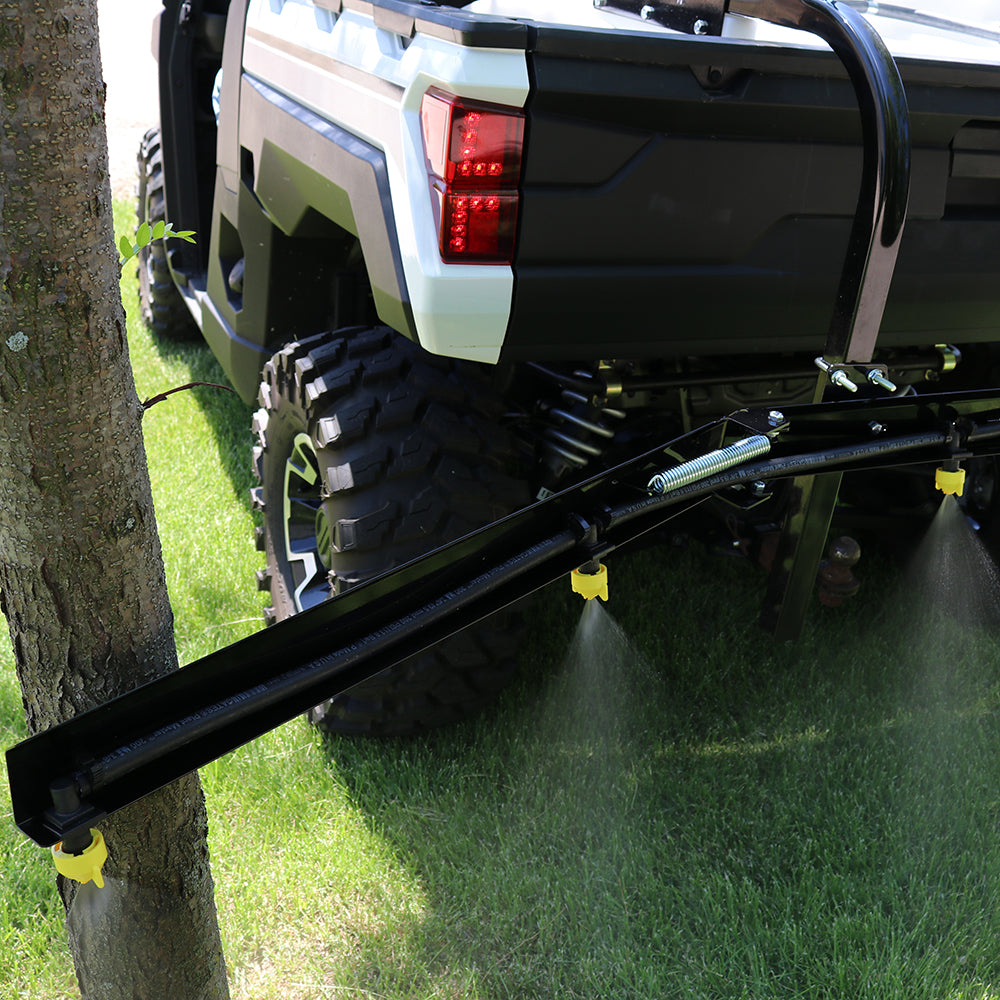 Broadcast Spraying: This deluxe UTV broadcast sprayer features the premium, heavy duty SSBK-620 broadcast spray boom that has a ten foot spray swath. Featuring quick attach, no-drip spray nozzles that prevent excessive chemical dripping after spraying. With fold-able wings, easily prevent damage from oncoming obstacles such as trees or fold wings in for more compact storage. Comes standard with six flat fan nozzles.