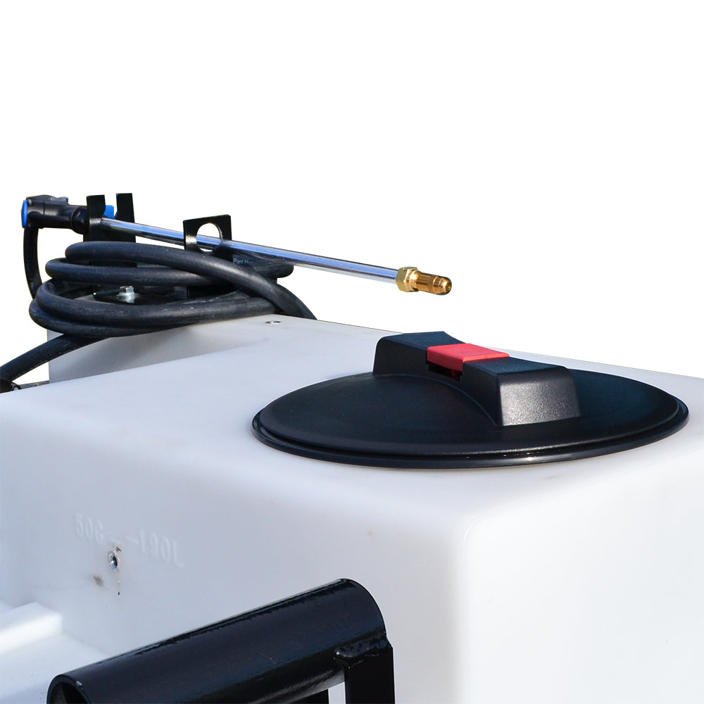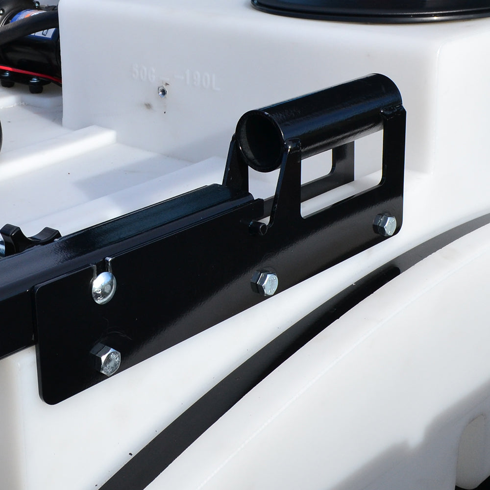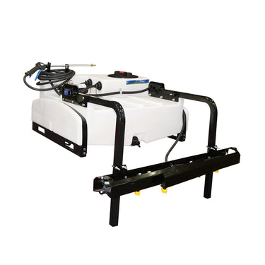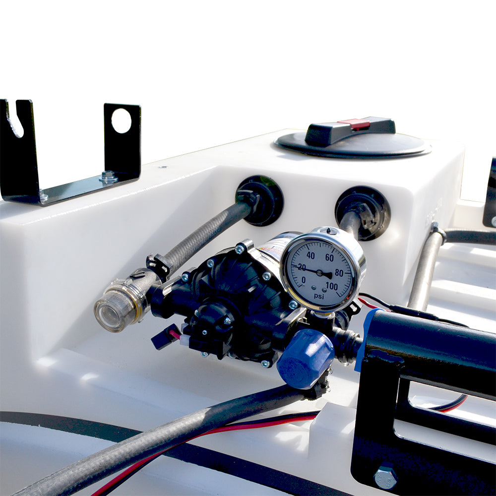 Sprayer Features: This 50 gallon UTV (side-by-side) unit is loaded with features that make spraying a breeze. Featuring a hinged over the gate EZ-lock boom mount that allows for quick boom removal or easy access to UTV (side-by-side) tailgate. Make pressure adjustments on the fly with the accessible driver side bay controls that include a robust Everflo 3.0 GPM diaphragm pump, pressure regulator, boom shut-off valve and pressure gauge. With a compact tank design, gain the visibility you need to monitor your spraying. Make filling swift with the wide mouthed 8” fill lid. Keep debris and chemical clumps from entering your pump with the easy to maintain QA inline strainer. Drain your sprayer completely with the angled base drain port. Finally, on-tank steel handles for effortless on/off lifting.