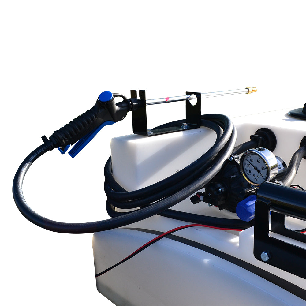 Spot Spraying: When it comes time to spot spray, un-holster your adjustable deluxe spray gun and reach up to 25 feet vertically and 30 feet horizontally from the comfort of your seat. Keep your 15 feet of hose from dragging and being damaged with the all-steel spray gun and hose rack.