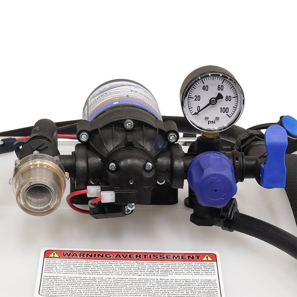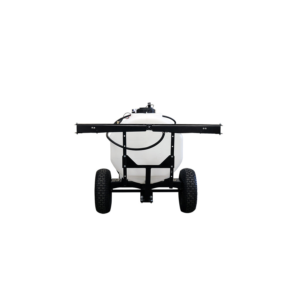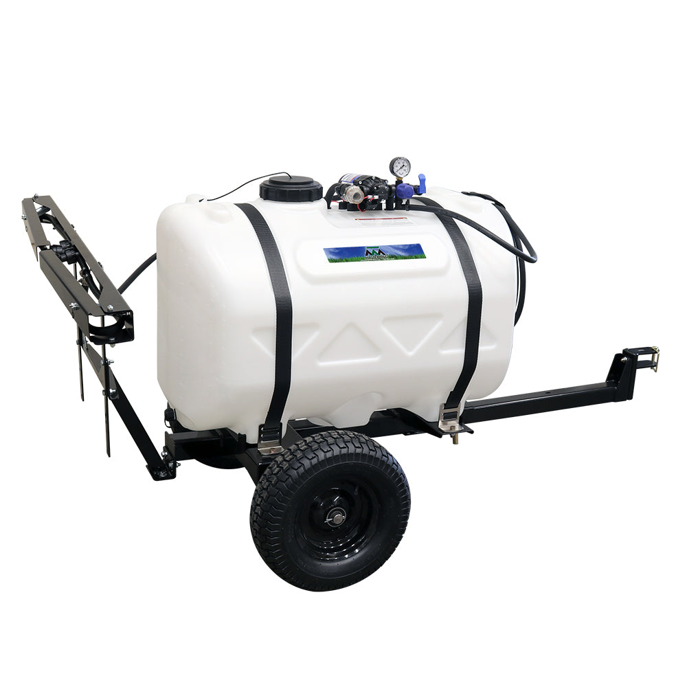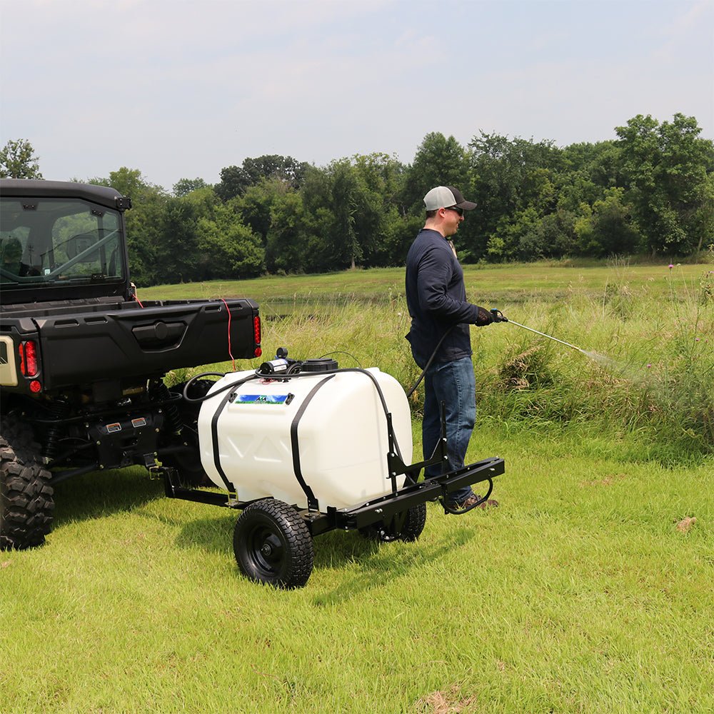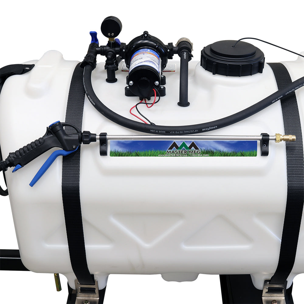Sprayer Features: Tackle more ground with the Master Manufacturing 60-Gallon Deluxe Trailer Sprayer. Powered by a robust Everflo 2.2 GPM 12V diaphragm pump, it includes a pressure gauge, adjustable regulator, and boom shut-off for full control. A quick-attach clear bowl strainer keeps debris out, while a hook-and-loop strap secures the 15-foot spray hose. The UV-resistant tank rides on 16" heavy-duty tires with a 1" axle. Comes standard with a 12V wire harness, on/off switch, and alligator clamps. Approved for Round-Up® and other common herbicides and insecticides. Backed by a 2-year pump and component warranty.