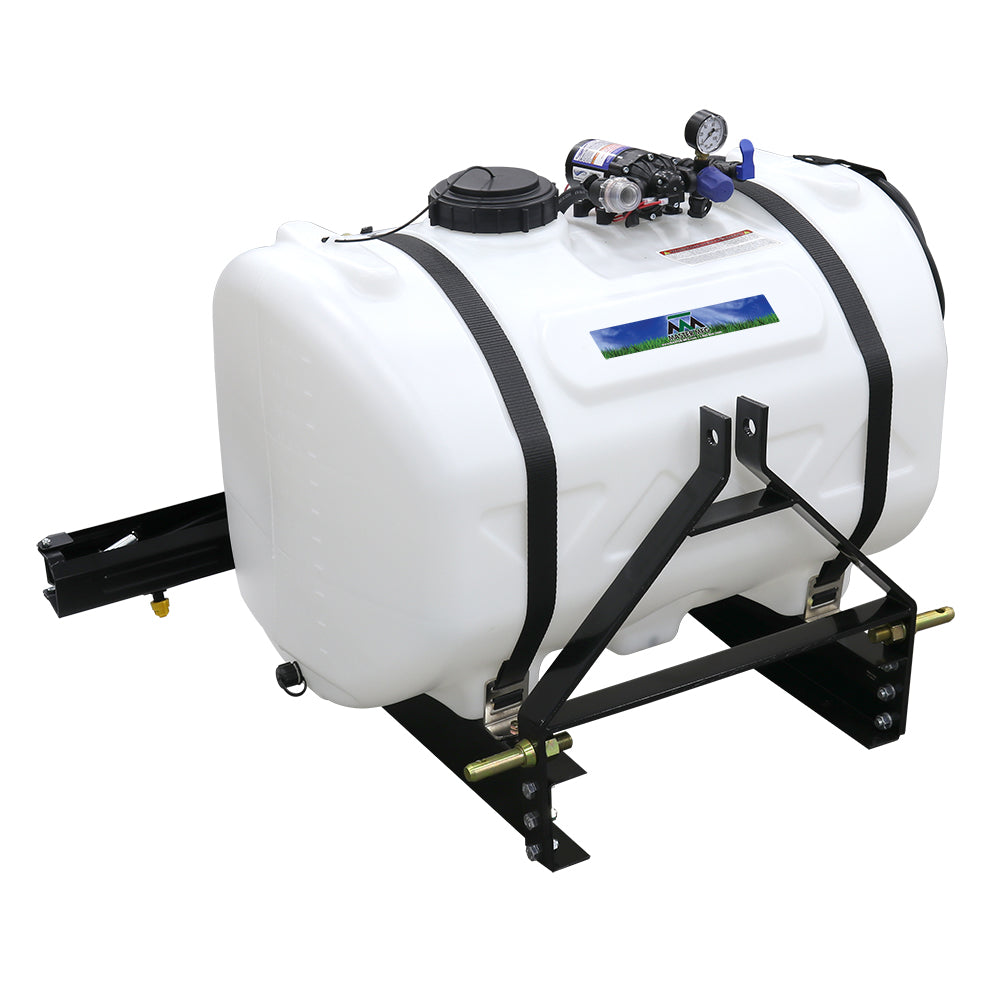 Sprayer Features: Power through tough jobs with the 60-Gallon Premium 3-Point Sprayer. Built with a robust Everflo 2.2 GPM 12V diaphragm pump, this unit includes a pressure gauge, adjustable regulator, and shut-off valve for precise boom control. The all-steel frame mounts quickly to any category one tractor, while the quick-attach inline strainer keeps debris from entering the pump. A hook-and-loop strap secures the 15’ hose, preventing drag and damage. Other highlights include thick tank walls for extra durability and a fast connection with the 12V wire harness. Approved for Round-Up® and other herbicides and insecticides. Backed by a two-year warranty on pump and components. (Compatible with UTVs after minor modifications.)