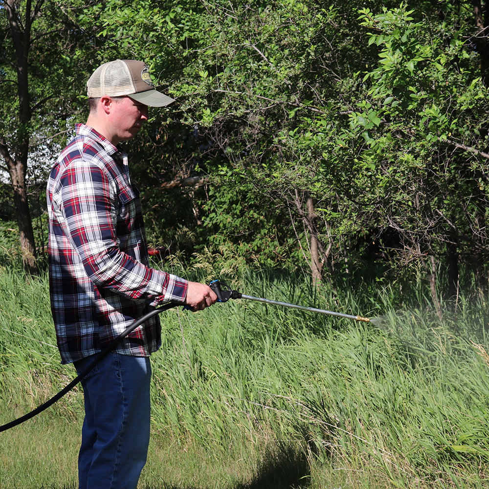 Spot Spraying: Easily cover hard-to-reach areas with the traditional spray gun, spraying up to 25 feet vertically and 30 feet horizontally. The brass nozzle adjusts from a steady stream to a wide mist in seconds. Field repairable and built to last, the gun also features a trigger lock to reduce fatigue during long spraying sessions.